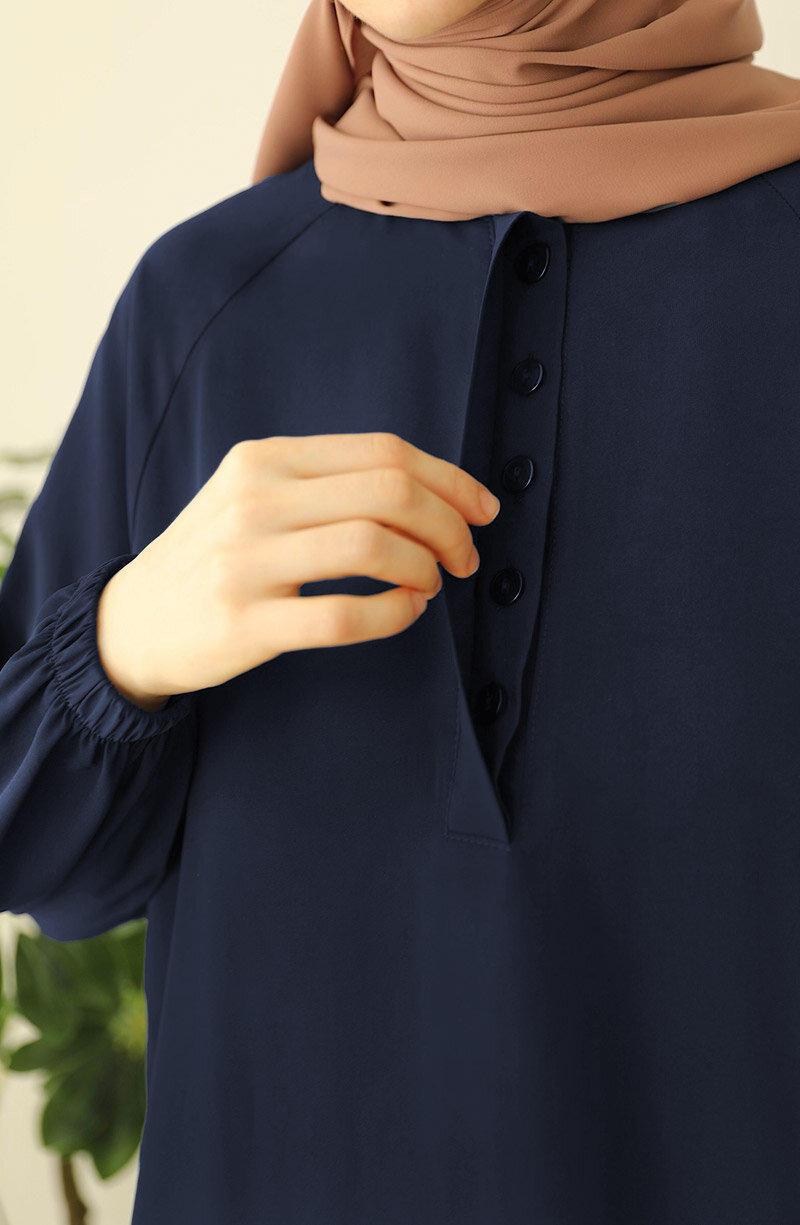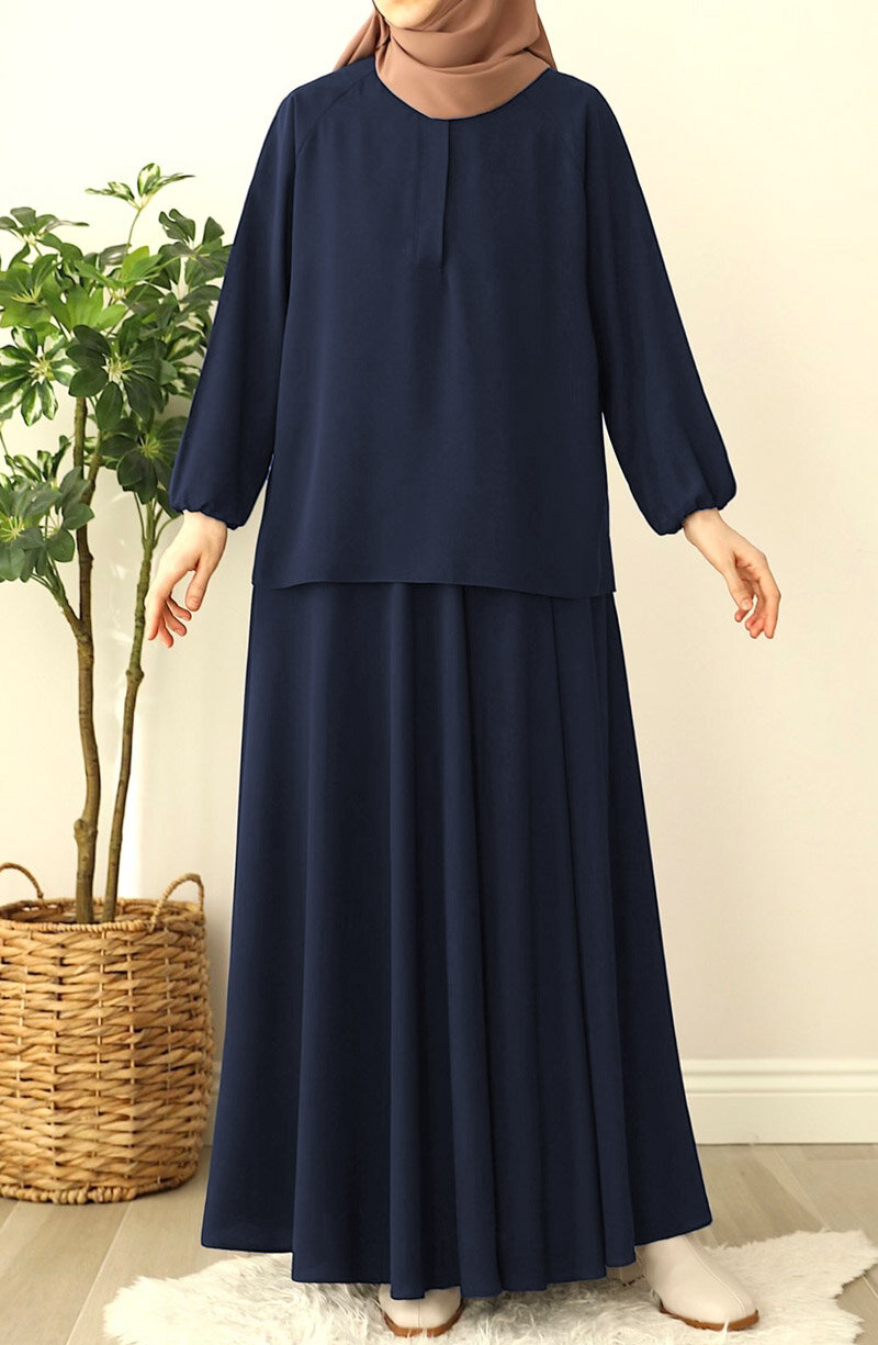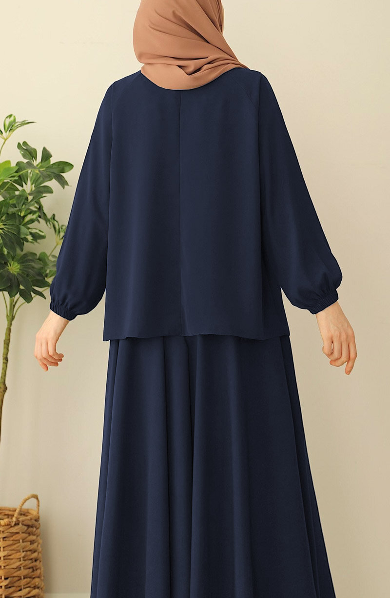 Üst kısmı geniş kalıp bluz, bluzun önü gizli düğmelidir. alt beli lastikli etek olarak ayrı parçalardan oluşan ikili takımdır |