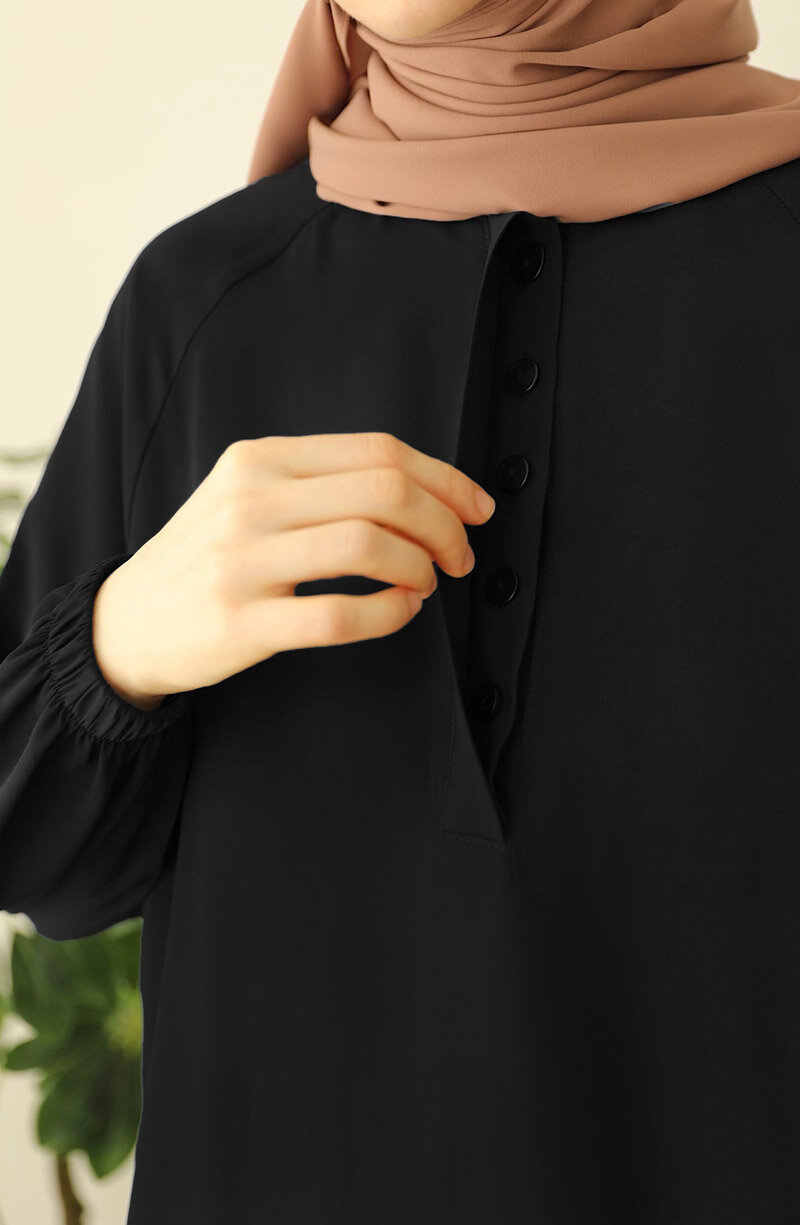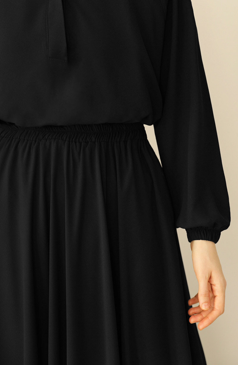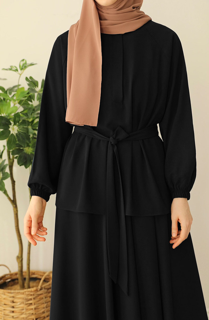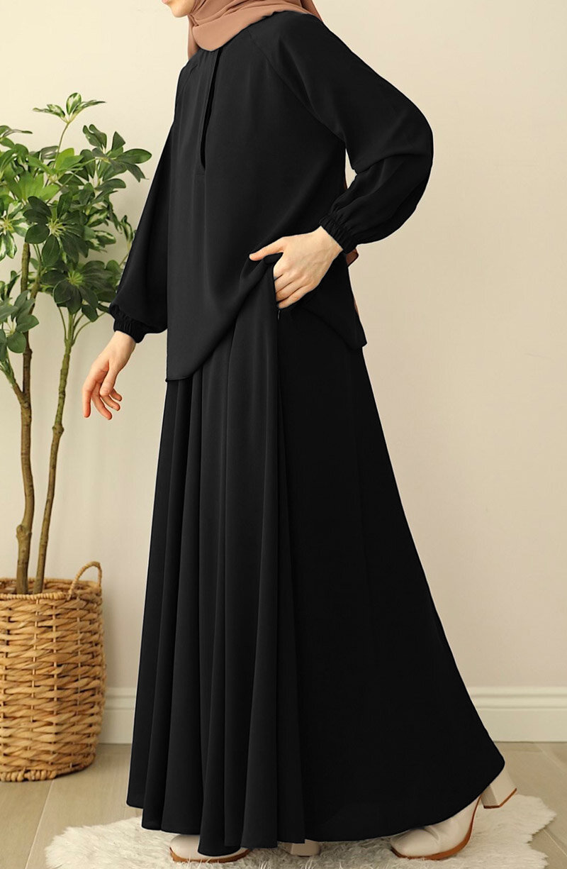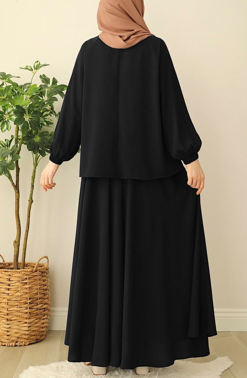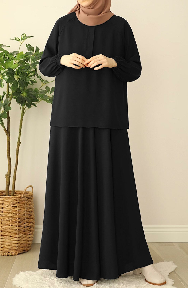 Üst kısmı geniş kalıp bluz, bluzun önü gizli düğmelidir. alt beli lastikli etek olarak ayrı parçalardan oluşan ikili takımdır |